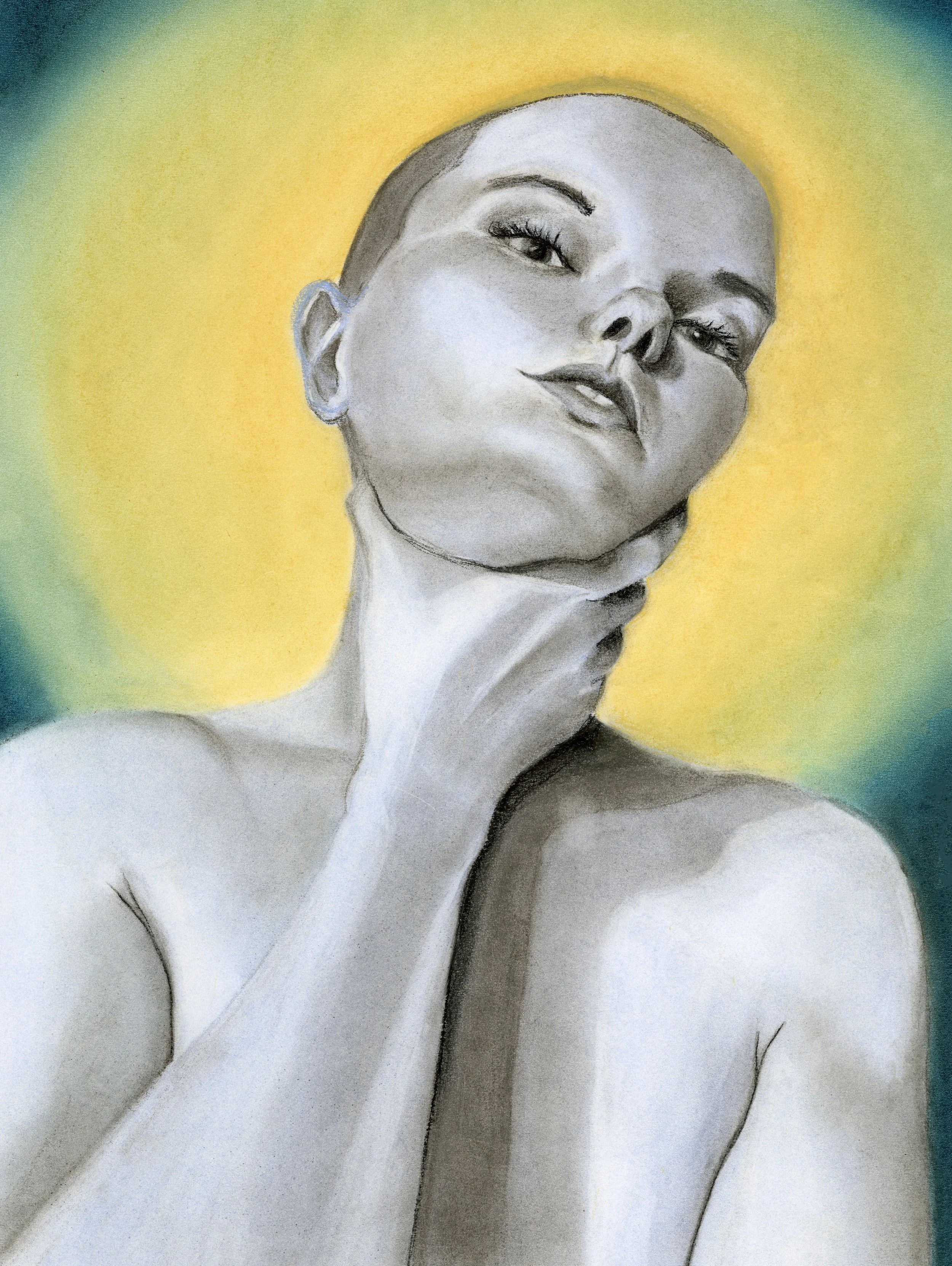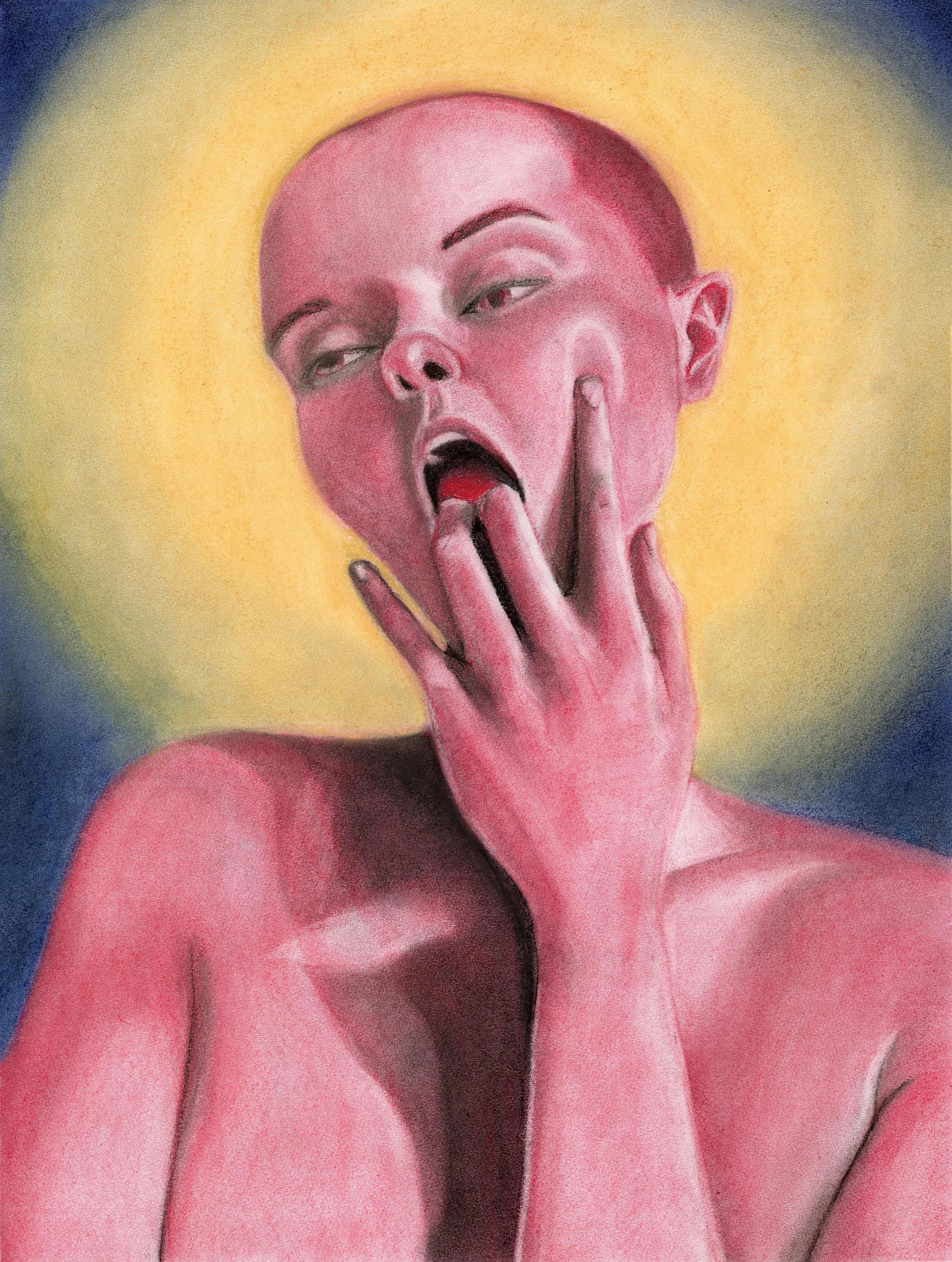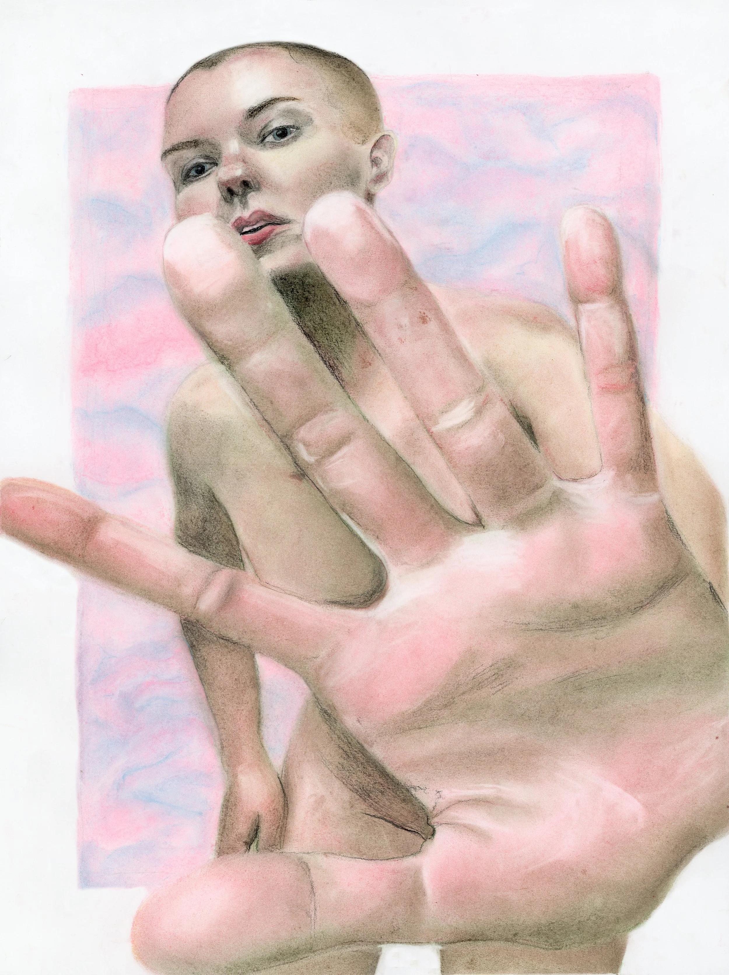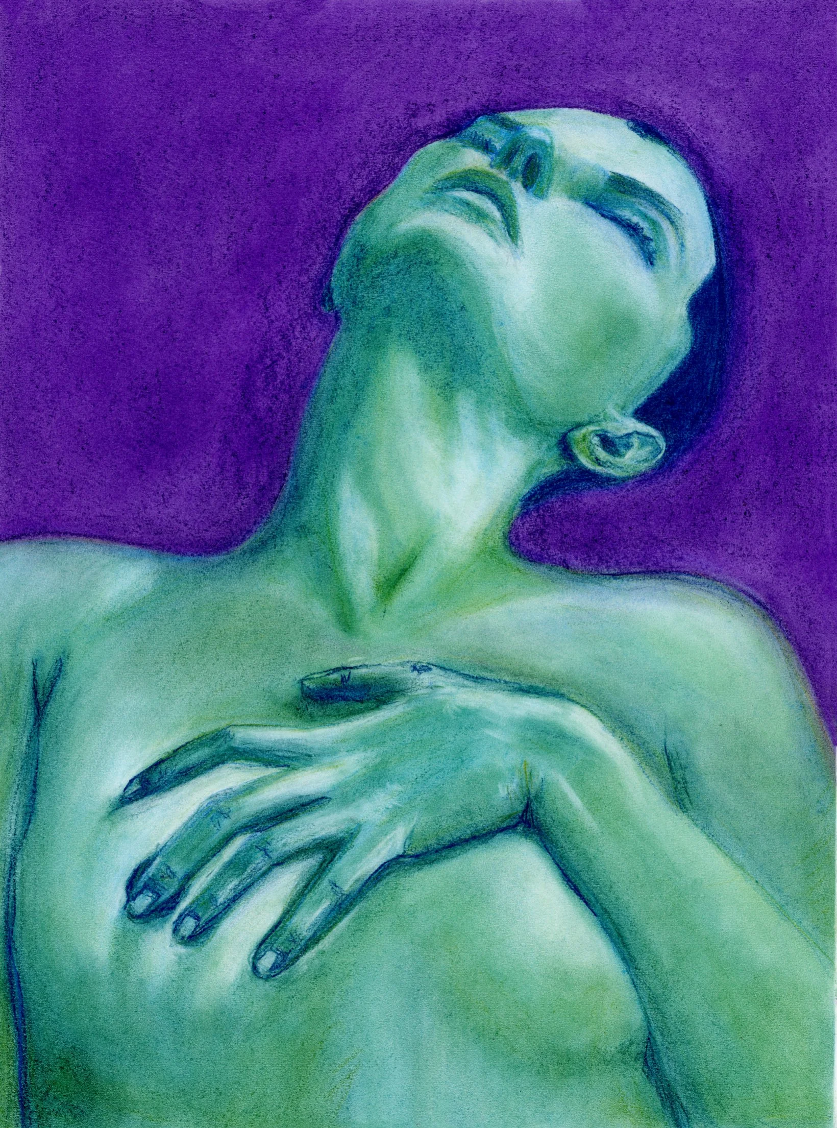 A few weeks shy of my 32nd birthday I sat in my friends clawfoot tub and thought to myself “what if someone was right here, looking at me from my lap.” I took a picture with my phone and started to draw it in my sketchbook. I completed the whole thing in colored pencil and felt unsatisfied. It was controlled. Restricted. Trying too hard.